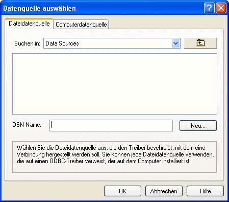 Rufen Sie IMPORT ODBC außerhalb einer Verbindung auf, die zuvor mit SQL LOGIN geöffnet wurde, erscheint das Dialogfenster zum Wählen der ODBC Datenquelle: