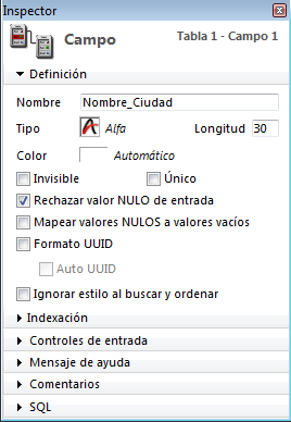 Nota: en 4D, los campos también puede tener el atributo "Obligatorio". Los dos conceptos son similares, pero su alcance es distinto: el atributo "obligatorio" es un control de entrada, mientras que el atributo "Rechazar valor NULO de entrada" trabaja a nivel del motor de la base de datos.