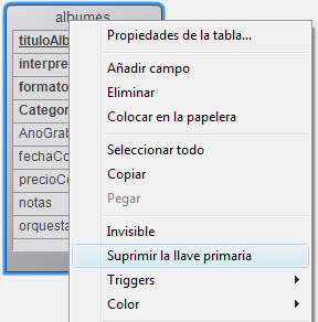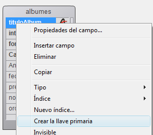 4D le permite crear y eliminar directamente llaves primarias vía el menú contextual del editor de la estructura.