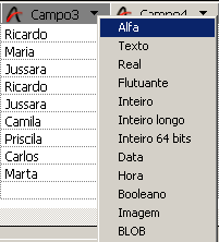 Também é possível modificar o tipo de dado dos novos campos clicando na barra de títulos de campos da área de visualização: um menu suspenso mostra os diferentes tipos disponíveis: