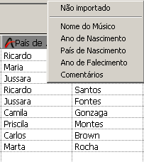 A barra de título de cada coluna indica o nome e o tipo do campo ao qual cada coluna será importada. Se for necessário, utilize o menu suspenso para selecionar um campo diferente.