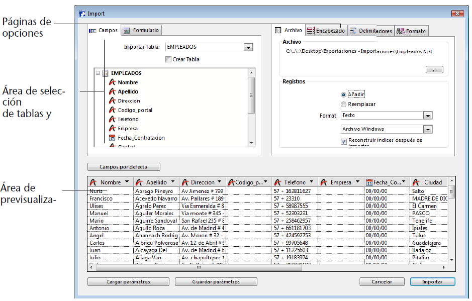Añadir o Reemplazar: los registros importados pueden reemplazar la selección actual (botón de radio Remplazar) o añadirse a los datos existentes y formar una nueva selección (botón de radio Añadir).