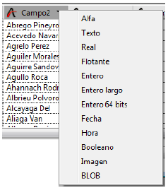 Crear una nueva tabla para importar los datos. Marque la casilla de selección Crear tabla. 4D creará una nueva tabla a la cual importará los datos. 4D determina el número de campos y el tipo de cada uno de acuerdo a los datos que se estén importando. Si quiere cambiar el nombre de la nueva tabla o de un campo, haga doble clic en el elemento correspondiente en el área de Selección de tablas y campos para que se vuelva editable o seleccionando la opción del encabezado Título de columna como nombre de campo (ver Página Encabezado). También puede modificar el tipo de datos de los nuevos campos haciendo clic en la barra de títulos de campos del área de vista previa: un menú desplegable muestra los diferentes tipos disponibles: La tabla se crea sólo durante la importación. Si cancela la importación o desmarca esta opción, la estructura de la base permanece intacta. Nota: con el sistema de acceso por contraseñas, puede desactivar la opción Crear tabla para evitar que los usuarios creen una nueva tabla en la base desde la caja de diálogo Importar. Para hacerlo, utilice la caja de diálogo Preferencias para crear un grupo que tenga acceso al entorno Diseño (por supuesto, primero debe activar el sistema de acceso por contraseñas 4D). Los usuarios no incluidos en este grupo de acceso, no podrán seleccionar la opción Crear tabla en la caja de diálogo Importar.