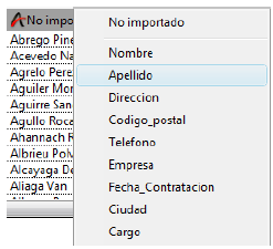 Si no se encuentra un campo compatible, la columna no se importa. Si quiere importar la columna, debe asignarle un campo manualmente utilizando el menú desplegable del encabezado de la columna en el área de vista previa.