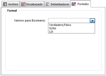 La sintaxis a aplicar es True_Valor;False_Valor. Por ejemplo, si importa un campo de tipo booleano cuyos valores son, por ejemplo, “Negro” (para true) y “Blanco” (para false), puede introducir Negro;Blanco. El combo-box muestra los tipos de formatos booleanos más utilizados. Puede introducir otro formato que no este en el combo-box.