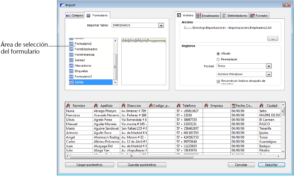 Nota para 4D Server: no es posible importar datos utilizando un formulario que contenga métodos en un procedimiento almacenado en el servidor. De hecho, como los eventos de formulario no son administrados en el servidor, no se llamarán los métodos asociados.