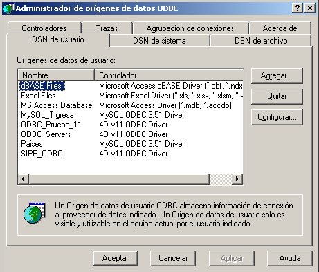 Em Windows, a definição de uma fonte ODBC é efetuada utilizando o painel de controle Ferramentas administrativas e depois origem dos dados (ODBC):
