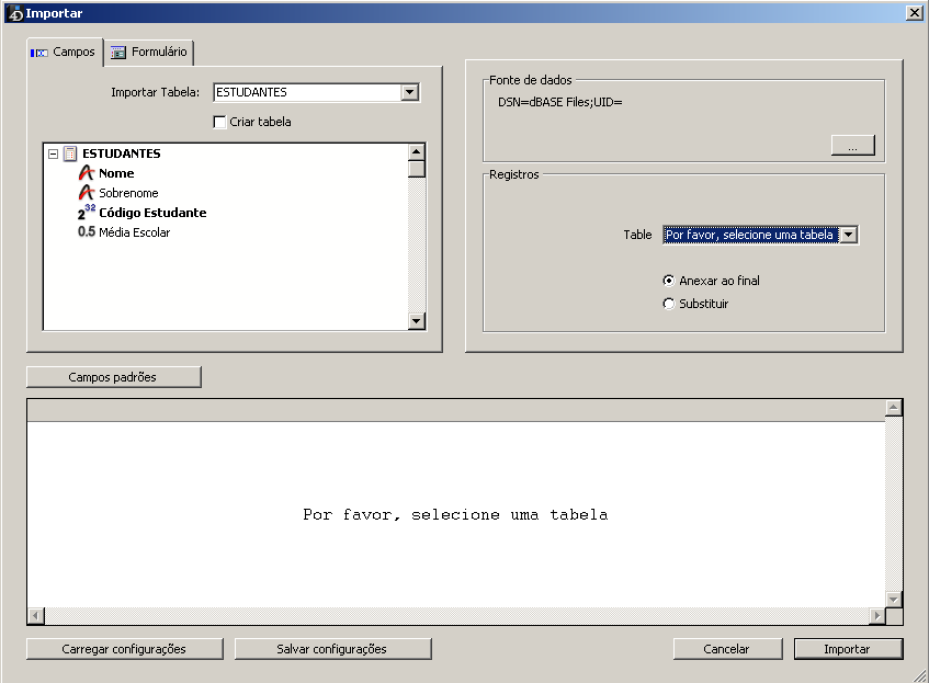 - Registros: pode adicionar ou substituir os registros da tabela de importação com os dados provenientes da fonte.