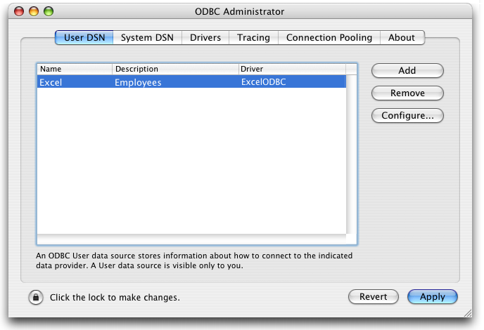 Bajo Mac OS X, la definición de una fuente ODBC se efectúa utilizando el programa ODBC Administrator ubicado en la carpeta Utilidades: