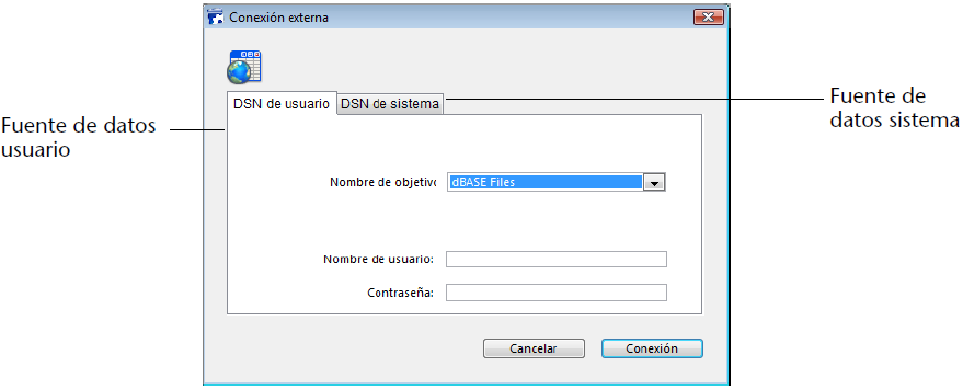 2. Seleccione el origen de datos a utilizar como también (si es necesario) los identificadores de acceso y luego haga clic en Conexión.