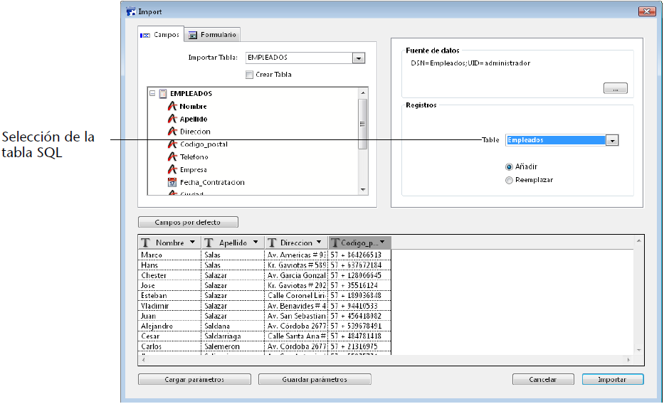 3. A la derecha de la caja de diálogo, defina la tabla SQL de la cual quiere importar los datos: