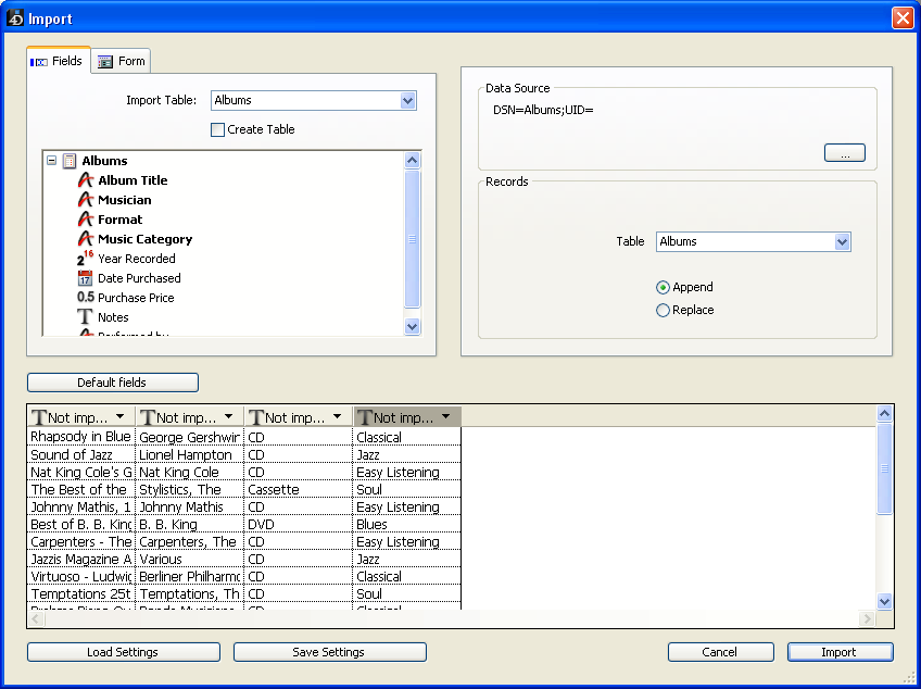 - レコード: ソースから読み込むデータを読み込み先テーブルのレコードに追加したり、または置き換えることができます。