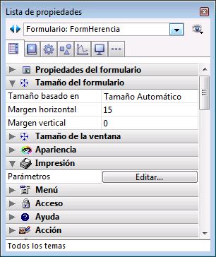 Para hacerlo, haga clic en el botón Parámetros/Editar... en el tema “Impresión” de la Lista de propiedades del formulario (ver el párrafo Propiedades de los formularios).