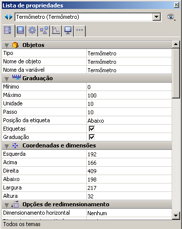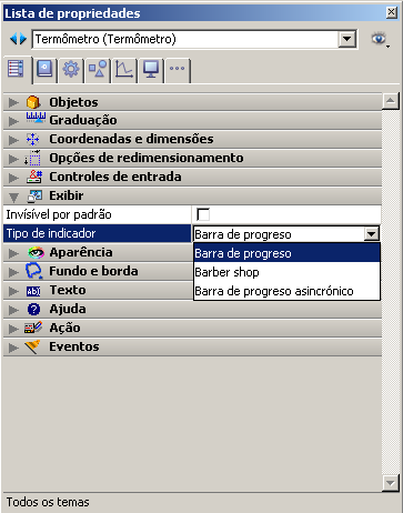 Além das propriedades padrão de aparência e localização, pode definir outras propriedades específicas para cada indicador: valor mínimo, valor máximo, unidades de graduação, os mínimos passos permitidos pelo indicador como também as opções de visualização.