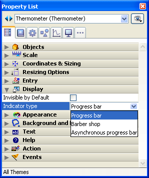 このタイプの進捗インジケーターは連続したアニメーションを表示します。“バーバーショップ”サーモメーターは通常プログラムが何らかの処理を行っていて、それが終了する時間が予測できない場合、そのことをユーザーに通知するために使用します。このバリエーションが選択されると"スケール"テーマは非表示になります。