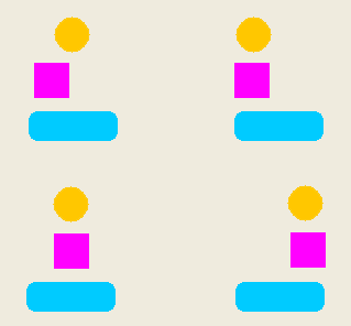 La siguiente imagen muestra objetos sin alinear, "alineación izquierda", "centrados horizontalmente", y "alineación derecha":
