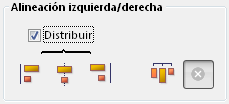 Para hacer una distribución específica, seleccione la opción Distribuir (por ejemplo si quiere distribuir los objetos basado en la distancia al lado derecho). Esta opción actúa como un interruptor. Si está seleccionada, cambia la función de los iconos ubicados bajo ella: