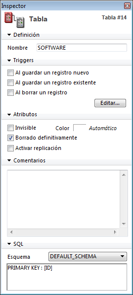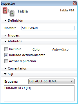 Las propiedades de los objetos del editor de estructura (tablas, campos y relaciones) pueden visualizarse y modificarse vía la paleta del Inspector: