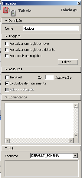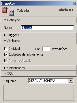 As propriedades dos objetos do editor de estrutura (tabelas, campos e relações) podem ser visualizadas e modificadas através da palheta do Inspetor: