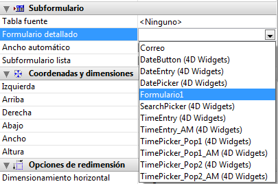 Del lado de la base principal, es imperativo que los subformularios provenientes de componentes se utilicen en modo página: en el editor de formularios, cuando el objeto subformulario se selecciona en el formulario padre, deselecciona la opción Subformulario listado en el tema "Subformulario" de la Lista de Propiedades.