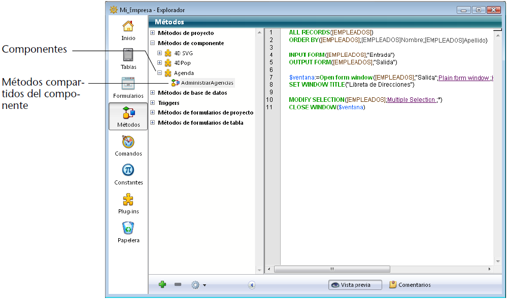 Cuando un componente se instala en una base local, su nombre aparece en la Current form table del Explorador de la base local, en el tema Métodos componente. Los métodos proyecto compartidos se listan como listas jerárquicas y si el componente es interpretado, su contenido se muestra en el área de previsualización.