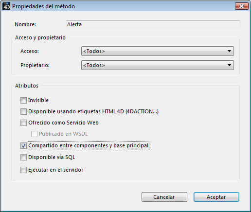 El efecto de esta opción está definido por el contexto de utilización de la base: si la base se utiliza como un componente, el método será accesible en la base local y visible en el Explorador. Si la base es una base local, el método será utilizable por los componentes.