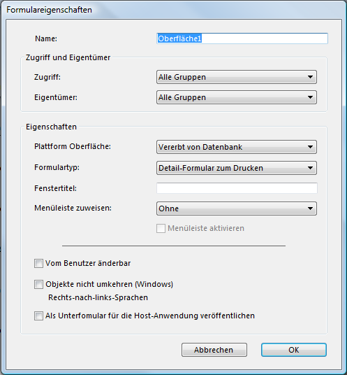 Hinweis: Sie erhalten dieses Dialogfenster über den Befehl Formulareigenschaften des Kontextmenüs des Formulars oder im Explorer über das Menü Optionen am unteren Rand (siehe Formulareigenschaften (Explorer)).