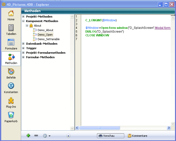Bei interpretierter Komponente erscheint der Inhalt der Methode in der Vorschau.