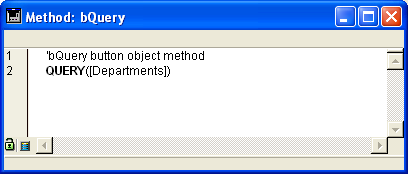 オブジェクトメソッドは、制御に使用するボタン等のオブジェクトにも作成することができます。これらのオブジェクトは、データベースを使用する上でとても重要です。これには、レコード移動や別フォームへの移動、データの追加、削除等を実行するボタンがあります。また、これらのオブジェクトは、データベースの使用を簡単にし、それを習得するために必要な時間を減少させます。ボタンにも、データ入力時と同様に内蔵の支援機能が使用可能です。オブジェクトメソッドを使用すれば、4D内に組み込まれていない動作を追加することができます。例えば、以下の図は、クリックされた時点でクエリエディタを表示するボタンのオブジェクトメソッドを示しています。
