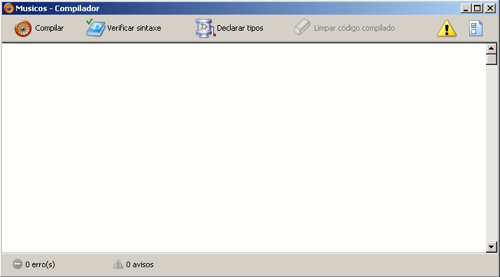Esta janela é utilizada para iniciar a compilação do banco de dados ou para verificar a sintaxe dos sistemas. Além disso, os botões permitem gerar/regenerar os sistemas de declaração do banco de dados, apagar o código compilado, mostrar ou ocultar advertências e acessar diretamente as Preferências.