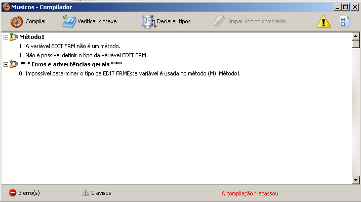 Só se geram os compiladores de sistemas necessários (ou seja, aqueles para os quais os elementos existem no banco de dados). A área de informação indica os eventuais erros encontrados durante a criação ou atualização dos sistemas. Fazer um clique duplo em uma linha de erro faz com que seja mostrado o sistema e a linha relacionada no editor de métodos.