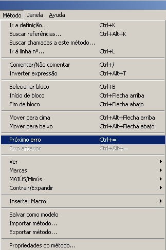 Faça um clique duplo em cada erro detectado a fim de abrir diretamente o sistema referido no WA SET URL FILTERS editor de métodos de 4D; seleciona-se a linha que contém o erro e aparece o tipo de erro na área de sintaxe da janela. Os comandos Erro seguinte/ Erro anterior do menu Método do editor lhe permitem navegar entre as linhas que contém erros: