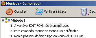 Se não são detectados erros, inicia-se a compilação propriamente dita. Se forem detectados erros, o processo é parado e a área de informação da janela mostra em forma de lista hierárquica os nomes dos sistemas e os números de linhas: