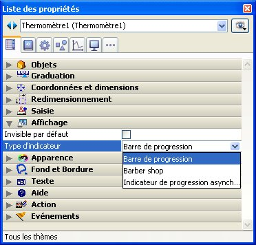 • Pour les indicateurs de progression, ces variantes sont définies via la propriété Type d'indicateur du thème "Affichage" de la Liste des propriétés :
