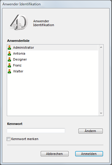 Das Dialogfenster Anwender Identifikation enthält standardmäßig die Schaltfläche Ändern, über die der aktuelle Benutzer sein eigenes Kennwort ändern kann. Wird die Liste der Benutzer angezeigt, ist der markierte Benutzer der aktuelle Benutzer. Wird die Liste nicht angezeigt, muss im Dialogfenster Anwender Identifikation zuerst der Name des aktuellen Benutzers eingegeben werden:
