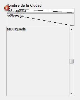 Esta composto dos seguintes objetos: uma área editável vsProcura, uma área não editável vsMensaje, e uma área de rolagem asProcura. Durante a entrada de caracteres em vsProcura, o método para esse objeto realiza uma pesquisa na tabela [Códigos postais], permitindo ao usuário encontrar cidades apenas pressionando os primeiros caracteres dos nomes da cidades.