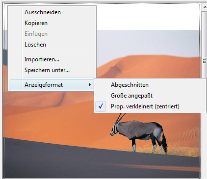 Über dieses Menü können Sie auch das Anzeigeformat des Bildes verändern. Es gibt die Formate Abgeschnitten, Größe angepaßt und Prop. verkleinert (zentriert). Die Änderung der Anzeige ist temporär, sie wird nicht mit dem Datensatz gesichert. Weitere Informationen dazu finden Sie im Abschnitt GET LIST ITEM PARAMETER