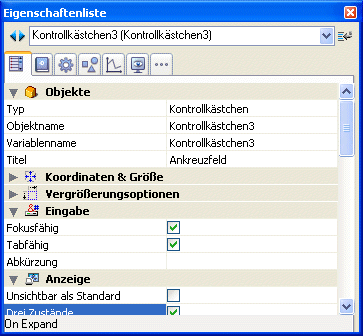 Objekte vom Typ Kontrollkästchen lassen einen 3. Status zu. Das ist ein Zusatzstatus, der in der Regel für die Anzeige verwendet wird. Damit können Sie z.B. einzelnen Objekten eine bestimmte Eigenschaft zuweisen, die nicht für alle Objekte gelten soll.