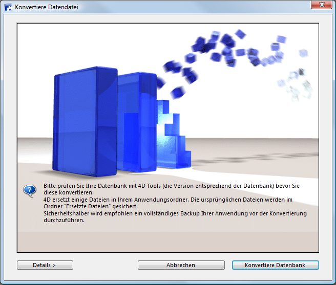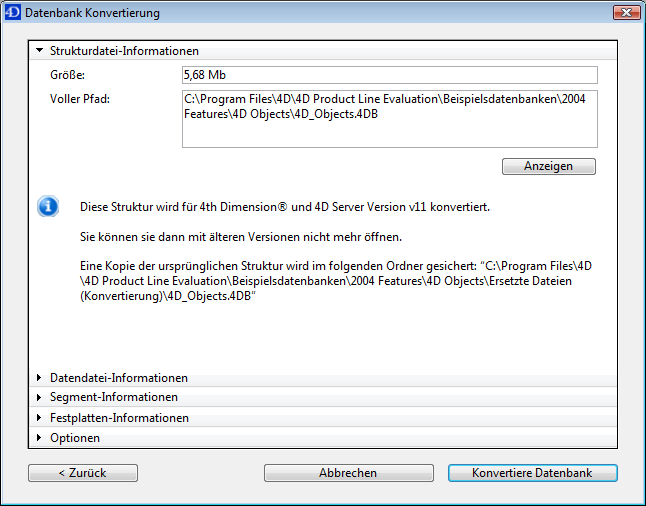 Strukturelle Veränderungen auf der Ebene der 4D Engine erfordern eine tiefergehende Konvertierung von Struktur und Datendatei älterer Anwendungen, die in Version 11 oder 12 konvertiert werden. Dafür steht ein spezieller Assistent zur Verfügung. Er macht vor der Konvertierung zur Sicherheit eine Kopie der Originaldatenbank, so dass Sie jederzeit zur alten Version zurückgehen können.