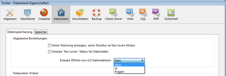 (*) Sie können die konvertierte Datendatei weiterhin in Version 12 öffnen. Diese Möglichkeit muss jedoch explizit in Version 12 mit der Option Erlaube Öffnen von v13 Datendateien in den Eigenschaften auf der Seite Datenbank/Allgemeine Einstellungen zugelassen sein: