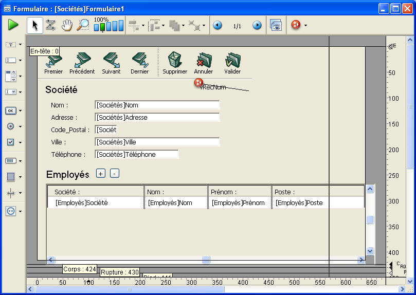 L’éditeur de formulaires affiche chaque formulaire ouvert dans sa propre fenêtre, dotée d’une barre d’outils et d’une barre d’objets. Vous pouvez ouvrir plusieurs formulaires en même temps. Les règles situées sur le côté et en bas de cette fenêtre ont pour but de vous aider à placer les objets dans le formulaire. Vous pouvez changer les unités que ces règles utilisent afin qu’elles soient affichées en pouces, centimètres ou pixels.