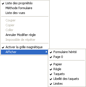 Dans le menu Formulaire, choisissez la commande Afficher. OU Utilisez la commande Afficher du menu contextuel de l’éditeur (cliquez avec le bouton droit de la souris en-dehors de tout objet). Cette commande fait apparaître un sous-menu hiérarchique listant les éléments que vous pouvez afficher ou masquer : Une coche placée en regard d’un élément indique son affichage.