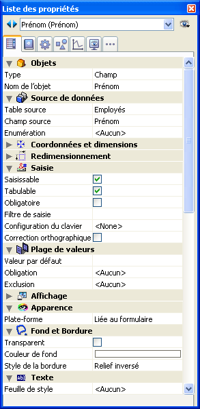 La première page (Général) affiche toutes les informations relatives à l’objet sélectionné via différents thèmes (Source de données, Saisie, Evénements, etc.). Vous pouvez déployer ou contracter chaque thème en cliquant sur l’icône de déploiement située à gauche de son nom, ce qui vous permet de n’afficher que les propriétés avec lesquelles vous souhaitez travailler. L’affichage est contextuel : seuls les thèmes et les propriétés pertinents pour le formulaire/type d’objet sélectionné sont affichés. L’affichage de certaines propriétés est également dynamiquement modifié en fonction de la valeur d’autres propriétés. Si, par exemple, vous assignez la propriété Saisissable à un champ, la propriété Tabulable s’affiche alors.