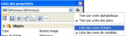 Vous pouvez également modifier le tri de chaque partie de la liste. Par défaut, la liste est triée en fonction du plan des objets (du premier plan vers le dernier plan). Le menu associé vous permet de trier la liste par ordre alphabétique.