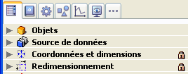 Dimensions : regroupe les propriétés définissant les coordonnées, la taille et le redimensionnement de l’objet.