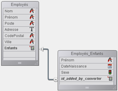 Rappel : Les sous-tables ne sont plus prises en charge à compter de la version 11 de 4D. Lors de la conversion d’une ancienne base, les sous-tables existantes sont automatiquement transformées en tables standard reliées aux tables d’origine par un lien automatique. La sous-table devient une table “N” et la table d’origine la table “1”. Dans la table 1, l’ex-champ de type sous-table est transformé en champ spécial de type “Lien sous-table” et dans la table N, un champ spécial, également de type “Lien sous-table” est ajouté. Il est nommé “id_added_by_converter”.