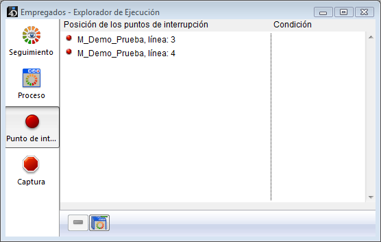 • La columna de la izquierda indica el estado activo/inactivo de los puntos de interrupción, seguido por el nombre del método y el número de la línea donde está ubicado el punto de interrupción (utilizando la ventana del Depurador o el editor de métodos).