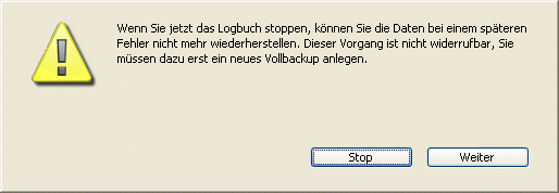 Wollen Sie das Mitschreiben der Operationen für das aktuelle Logbuch stoppen, gehen Sie auf die Seite Backup/ Konfiguration der Datenbank-Eigenschaften und deaktivieren die Option Benutze Logbuch.