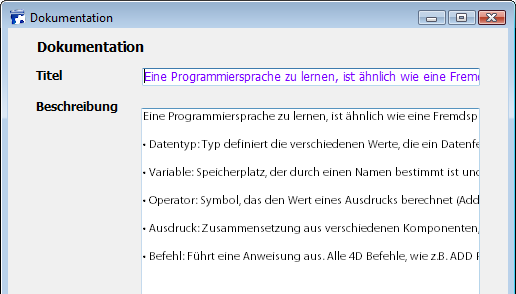 4D führt keine automatischen Zeilenumbrüche aus, das als letztes anzeigbare Wort kann abgeschnitten sein. In Bereichen vom Typ Text werden Zeilenumbrüche unterstützt: