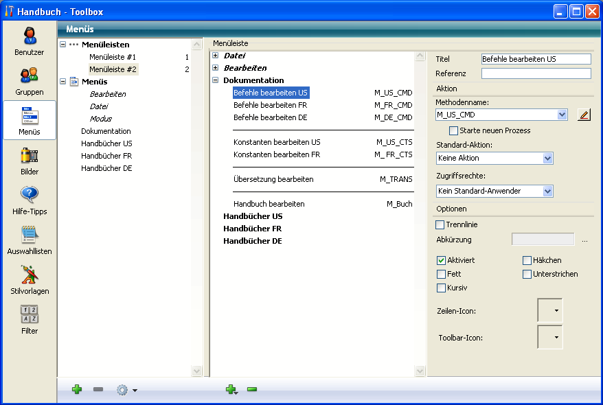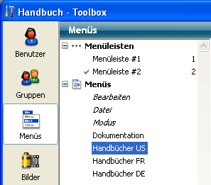 Ein Häkchen markiert das Element, d.h. Menüleiste oder Menü, zu dem das gewählte Menü gehört. Ist ein Menü mehreren Einträgen zugeordnet, erscheinen mehrere Häkchen. Im folgenden Beispiel ist das Menü "Handbücher US" der Menüleiste #2 zugeordnet:
